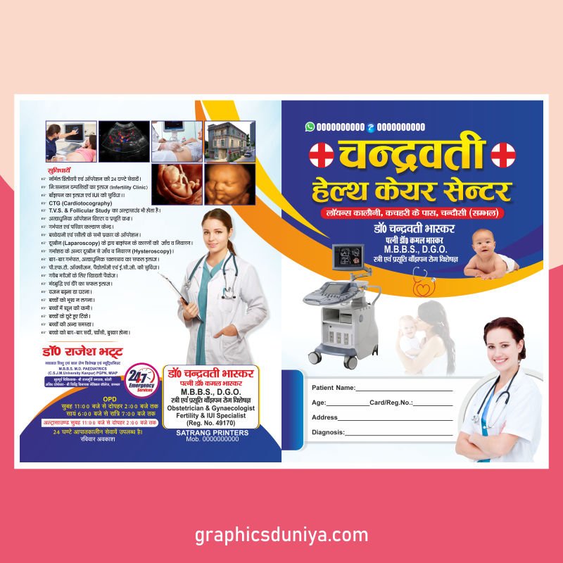 “Design a Center-Opening or Side-Opening A4 Folder. Theme: [Choose: Medical Blue OR Baby Soft Colors]. Front: Logo + Patient Fill-in-the-blanks box + High-quality image. Back: Service list + Address + QR Code for Google Maps location. Inside Pocket: Business card slot + Instructions text.”